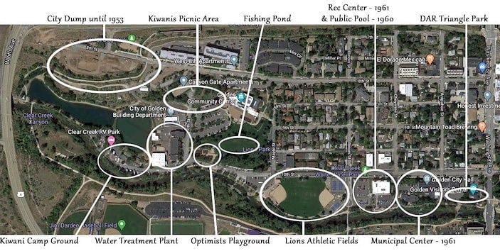 During the 1950s and '60s, several clubs in Golden were working to fix up the area on the north side of Clear Creek (now Lions Park). The Kiwanis Club built the camp ground. The Optimists built a playground. The Lions installed baseball diamonds, The DAR installed picnic tables. The City built a swimming pool and recreation center.
