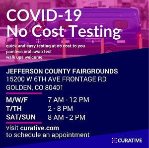 The Jeffco Fairgrounds testing site accepts reservations and also welcomes walk-ins. Monday/Weds/Fri 7AM-noon; Tues/Thurs 2-8PM; Sat/Sun 8AM-2PM.