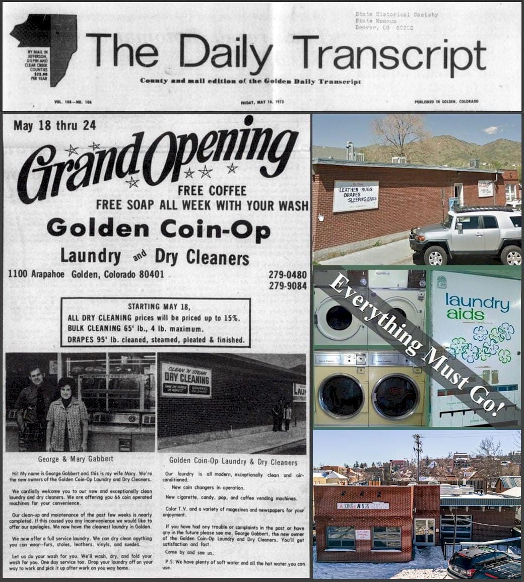 The May 16, 1975 Colorado Transcript announced the grand opening of the Golden Coin-Op Laundry and Dry Cleaners. It operated at 1100 Arapahoe until 2017, when the laundromat closed and the building was converted into Colorado +49 Cidery. The Cidery is now the King of Wings.
