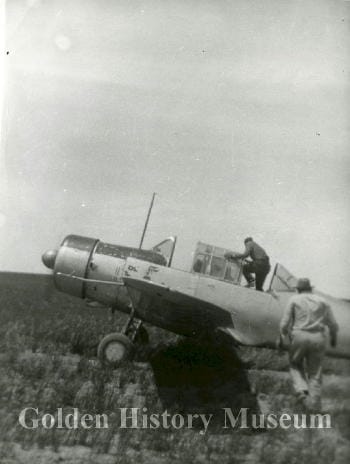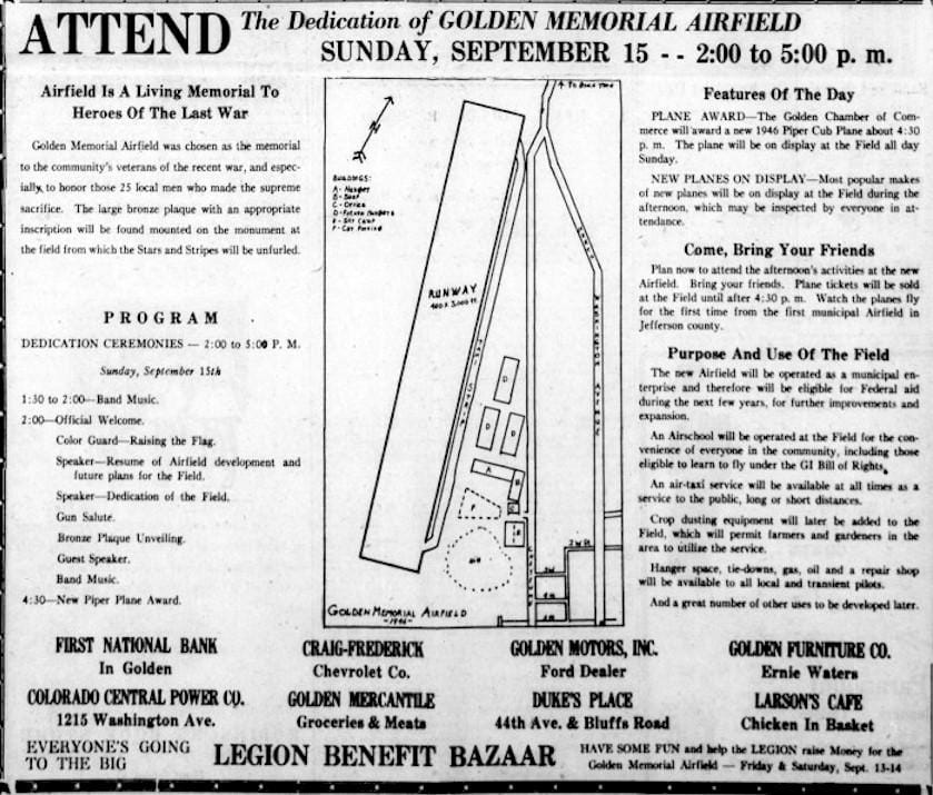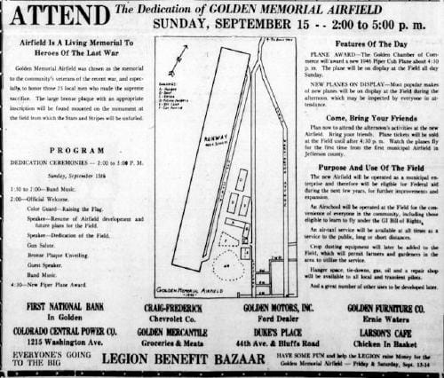 Opening Day came and 1000 people attended. Chamber President Everett Barnhardt and Mayor Joe Kellogg spoke, a bronze plaque dedicating the airport was unveiled, and Earl Armstrong of 512 16th Street (map) won the Piper Cub. The prize plane was flown into the site for the future airport, but returned to a hanger in Lakewood afterwards, as the the Golden site still required grading, marking, and more. People were urged to donate more money to make the airport possible.