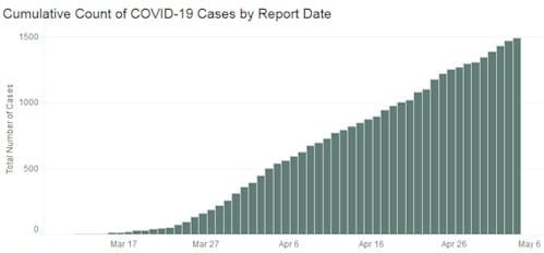 Jefferson County’s case count page says that as of 3PM yesterday, there were 1,493 cases in Jefferson County (up from 1,473). There have been 84 deaths (up from 82) and 287 are hospitalized (up from 285). There are 113 known cases in Golden (unchanged).