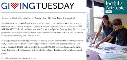 Because the COVID-19 epidemic has caused hardship to so many non-profit organizations, tomorrow has been declared as Giving Tuesday. Foothills Art Center is asking that you include them in your giving plans.