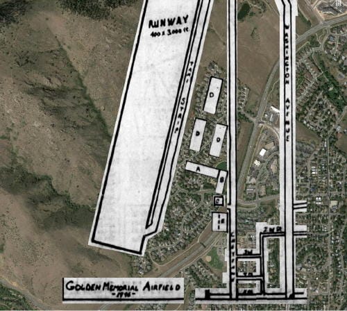 Some very eager Golden boosters seized on this faint encouragement to lease some property northwest of the City from the Parfet family. They drew up a rough plan for an airport and announced an opening date for the “Golden Memorial Airfield” (in honor of those who had died during WWII). They persuaded the Chamber to sell raffle tickets to help build the airport, and the winner of the raffle would win a brand new Piper Cub airplane.