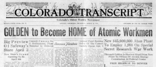 The March 29, 1951 Colorado Transcript announced the Federal Government’s plan to build a $45 million “Atom Plant” north of Golden. They did not state that the plant would produce a part used in atomic weapons–that information would have been top secret.