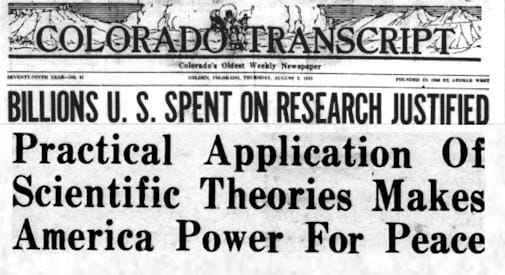 Instead, the editor wrote a piece saying that our ability to harness the atom promised a brilliant future. He offered ironic praise to the Communists for pressuring us into doing atomic research: “In years to come, when we are spinning the world with the atom, and taking it easy–we must give the dictators credit for scaring us into spending all the money and doing all the work that was necessary to make an Atomic Age with its unlimited, inexhaustible, inexpensive power possible.”