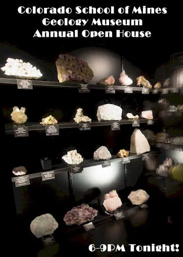 The Colorado School of Mines Geology Museum is holding an open house tonight from 6-9PM. Come and visit with our Museum’s Advisory Council members, prominent mineral collectors and sellers, Museum staff and volunteers, Friends of the Museum, old friends and new acquaintances, and browse the expanded Museum Store. Enjoy a variety of new displays. During the past year, the Museum received a collection of rare Colorado Territorial Gold Coins on loan from Jan Meyer, who has graciously allowed us to tell the story of early mints in Colorado. The seventh mural in the Irwin Hoffman series on the History of Mining will be on display. As always, the event offers free appetizers and a cash bar. There is no cover charge. See you there!