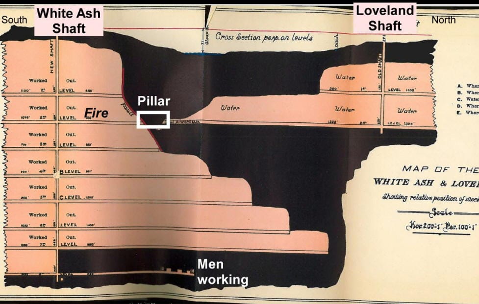Inspector McNeil formally determined that the rock and coal pillar separating the Old Loveland and White Ash mines broke, likely weakened by a coal fire, allowing water to burst through the blocked-off 280-foot tunnel of the White Ash Mine. Water flowed quickly across the tunnel to reach the vertical shaft and then down to the 720-foot level, filling the side tunnel and drowning the ten miners. The event was the biggest disaster in Golden’s mining history.
