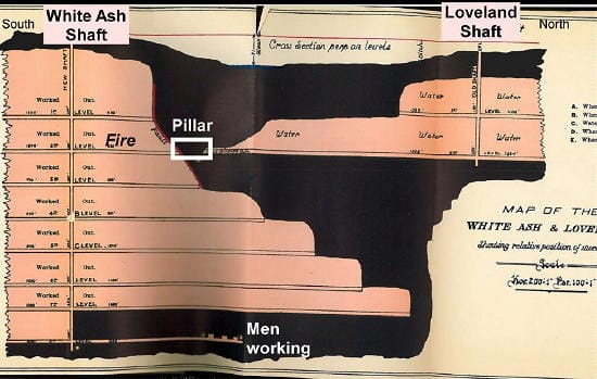 Meanwhile, the Old Loveland Mine, (aka Black Diamond Mine) was about 1960 feet north of the White Ash Mine (Fig. 75), where the White Ash coal seam extended under and across Clear Creek. The Old Loveland Mine had been abandoned in 1879 due to suffocating inert gases, carbon dioxide, aka “black damp,” at the 250-foot level. The abandoned Loveland shaft and tunnels were left to fill by water seepage. In 1889, the flooded mine was being used as a water source for the steam boilers at the nearby Golden Brick Works. A pillar of rock and coal 70-100 feet thick separating the abandoned tunnels of the Loveland and White Ash Mines (Fig. 75) had been considered “safe enough” by Inspector McNeil and others.