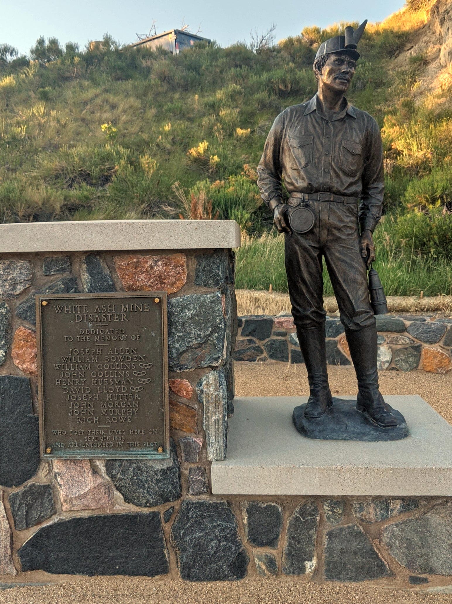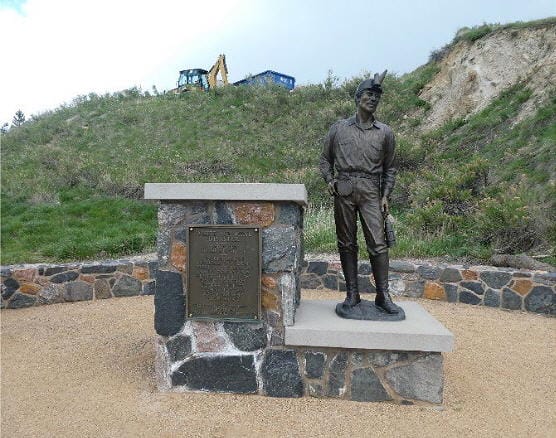 Thereafter, the White Ash Mine was abandoned and at one point in time, was considered a cemetery.194 Until the 1950s, on the anniversary of the disaster, Goldenites placed flowers and held a memorial at the former mine site. On 9 September 1936, in commemoration of the lives lost in the tragedy, a monument was placed at the west end of the CSM football field near the mine shaft. The ceremony, attended by 1000 Goldenites, was led by Mayor Bert Jones, the son of former mine foreman, Evan Jones, who sought to rescue the trapped miners 47 years earlier.195 A new memorial (Fig. 76) was dedicated by former Golden Mayor Marv Kay on 29 October 2016. It is on the CSM campus across from the football stadium (Marv Kay Stadium) near the west end of 12th Street, where it is Stop 7a on the Weimer Geology Trail (Chapter 4).