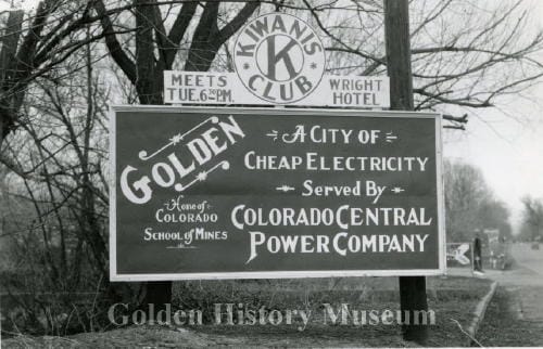 This is a black and white photograph of a large sign reading “Golden / Home of Colorado School of Mines / A City of Cheap Electricity / Served by / Colorado Central Power Company.” Above the main text of the sign is a circular Kiwanis Club logo flanked by “Meets Tue. 6:30 P.M. / Wright Hotel.” Behind this sign in the background a sign in the shape of an arrow pointing left is visible, which reads “Golden Tourist Park,” a business that was located near Jackson Street and 23rd. This photo is one of four similar photos of the same sign taken from slightly different angles.
