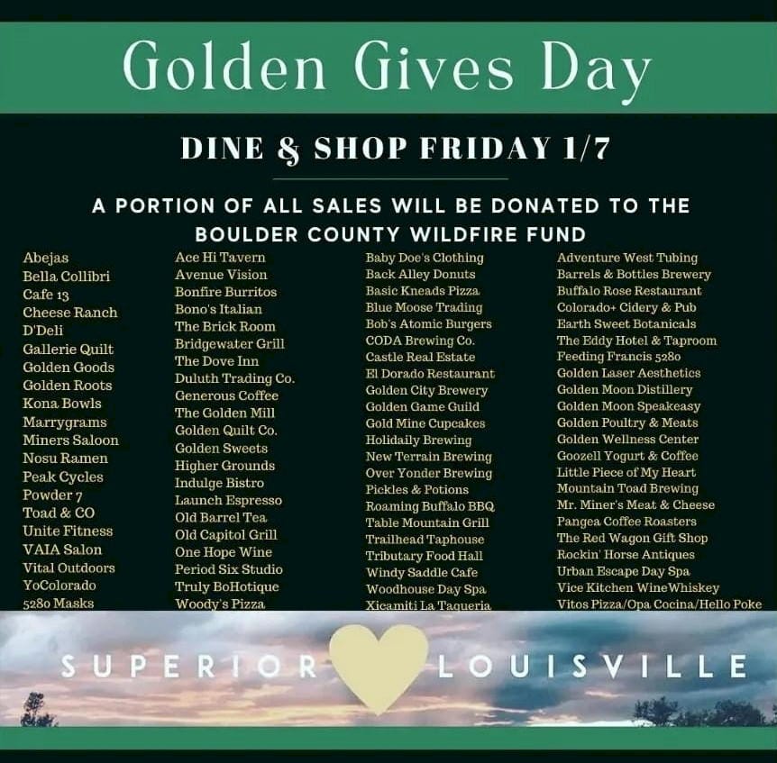 We were all shocked by the windstorm and wildfire that destroyed nearly 1,000 homes last week. Scores of Golden businesses have pledged to give a portion of today’s sales to the Boulder County Wildfire Fund. This is an excellent reason to get out and shop and dine with Golden merchants. See a list of participating businesses….