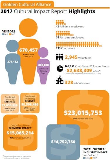 You may not be aware that Golden’s cultural organizations serve more than twice as many visitors. In 2017, members of the Golden Cultural Alliance had 670,457 visitors! Not only do our museums, theater groups, music, lecture, and film events make life interesting in Golden, they also bring significant fiscal value. A 2017 study of Golden Cultural Alliance members calculated that the total cultural industry impact for Golden was more than $23 million!