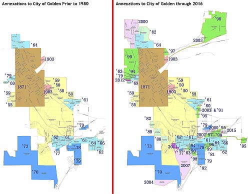 In the 1990s, we annexed several business and light industry areas, including the King Soopers Shopping Center and the Coors Technology Center. The big residential district added during that decade was Canyon Point. Golden’s citizens became irritated with their government during the ’90s, and voted in two notable changes. One was a restriction on tax incentive deals, as a result of the agreement made over the King Soopers area. The other was the 1% residential growth limit. People were displeased when formerly open land was built over with houses. They thought Golden was allowing too much growth, to the detriment of our small town way of life, and they voted to limit growth to our historic rate of 1% per year.