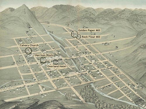 The Overland Hotel, Rock Four Mill, and Golden Paper Mill are gone, but the Harrison Block and Calvary Church are still with us!