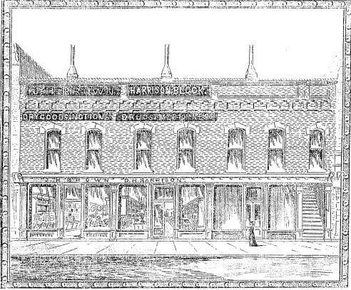 The Harrison block, newly-completed, was already being enlarged. Mr. Harrison was adding a second floor, which was “to be used as a public hall for lectures, dancing, &c.” The Harrison Block now includes Creekside Jewelers and Del’s Tonsorial Parlor.