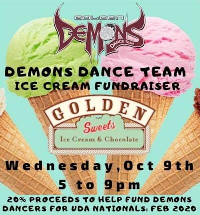 5-9PM Golden Sweets is holding a fund-raiser this evening for the Golden High School Demons Dance Team. It’s a good night for ice cream…20% of the proceeds till be donated to the Dance Team!