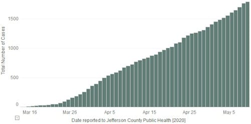 Jefferson County’s case count page says that as of 4:30PM yesterday, there were 1,793 cases in Jefferson County (up from 1,749). There have been 94 deaths (up from 93) and 313 are hospitalized (up from 306). There are 147 known cases in Golden (up from 144).