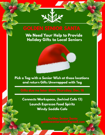 Participating seniors provide their “wish list” items which are available on tags that can be picked up at Windy Saddle, Launch Espresso or Connects Workspace (behind Café 13). Simply pick up a tag and return the unwrapped gift with the tag by December 14th.