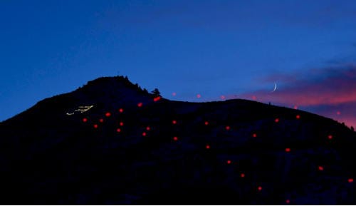 The previous Sunday, several Golden residents had spotted a red, glowing object over Lookout Mountain. It appeared again on Monday night, so two Golden policemen hiked up the hill and found some School of Mines students creating the UFOs by attaching lighted flares to helium-filled balloons. They loosed the balloons and let them float over Golden.