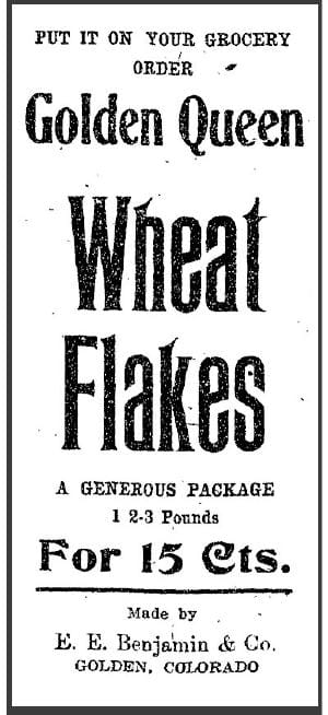The May 4, 1916 Transcript featured an article about Golden’s newest manufacturing product, Golden Queen Wheat Flakes. It stated that Golden was the only place the product was made, and that the owner planned “to push the sale of the food in the Rocky Mountain region…. At present the machines have a capacity of 1,000 packages a day.”