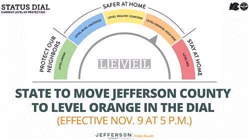 As of 5PM this evening, Jefferson County will be at Level Orange – High Risk. This means that more stringent public health rules will be effect. See the City’s webpage for more information.