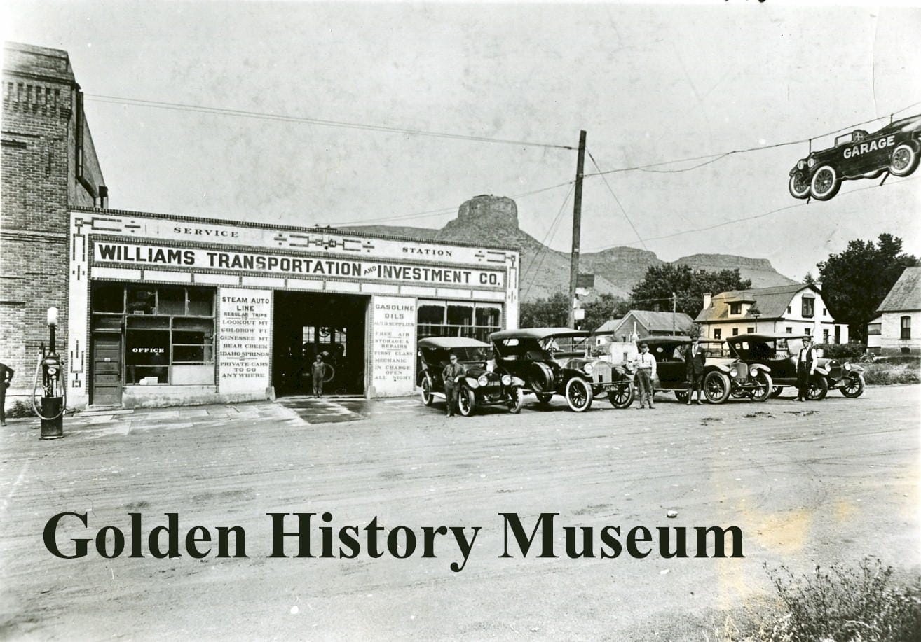 Bill Williams built the Lariat Loop Road and owned a fleet of touring automobiles, which he used to take tourists on excursions into the mountains. Note the sign on his garage that advertises trips to Lookout Mountain, Colorow Point, Genesse Mountain, Bear Creek, and Idaho Springs.