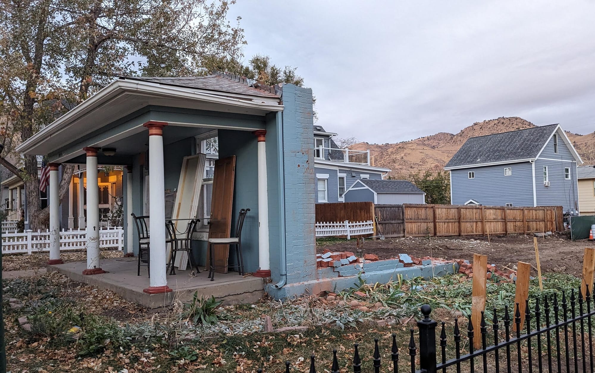To my delight, the top coat of black paint has begun to fade, and the missing part of the mural is reemerging! Thanks to the passage of time and the sun exposure on that western wall, I’ve been reminded that the mystery painting was Castle Rock on South Table Mountain.