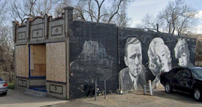 Today, the building may be most memorable for the murals on the west side. Humphrey Bogart, Marilyn Monroe, and Marlon Brando were painted about twenty years ago. There was a fourth panel, and after a few years, it was painted over in black paint. When that happened, I realized that I couldn’t remember the subject of that panel. Since the other three were faces, I assumed that it had been a fourth person. I asked a few friends, and they couldn’t remember either.