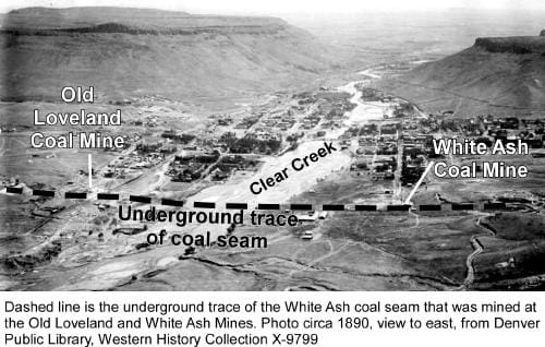 Coal-mine workings in central Golden were located along a vertical coal seam trending north-south below ground (see PHOTO). The seam, known as the White Ash coal seam, extended from near 19th Street, across the site of today’s Mines athletic fields, under Clear Creek, and past today’s Mitchell Elementary School. It had been mined in the Old Loveland Mine (originally called the Black Diamond Mine) on the north side of Clear Creek starting in 1869. The Old Loveland Mine was abandoned in 1879 and allowed to fill with ground water seeping from overlying Clear Creek.