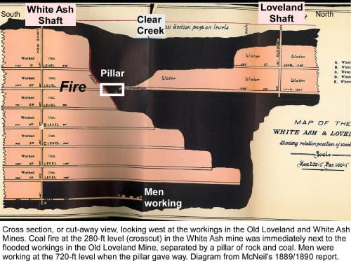 Several hours after water burst through the 280-foot opening into the main shaft, the mine foreman, Evan Jones, and the State Coal Mine Inspector, John McNeil, were lowered down the main shaft in a bucket, trying to reach the trapped miners. Although suffocating carbon dioxide gas and extreme heat forced them to abandon that effort, they discovered that the coal fire was still fiercely burning in the 280-ft crosscut. The fire had never been extinguished. McNeil, in his 1889/1890 report, concluded that the water pressure from the flooded and abandoned Old Loveland Mine, coupled with the coal fire at the 280-ft level in the White Ash Mine, weakened the pillar separating the two workings, leading to the White Ash Mine Disaster. The White Ash Mine workings eventually filled entirely with water to 80 feet below the ground surface, and the Mine closed forever. That flooding extinguished the coal fire, but at an awful human cost.