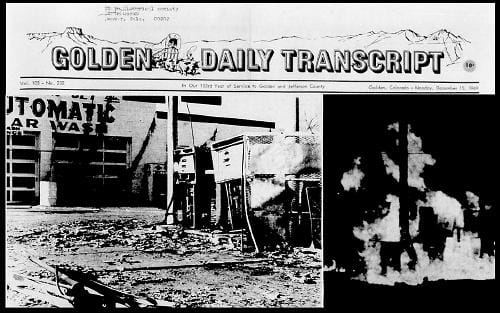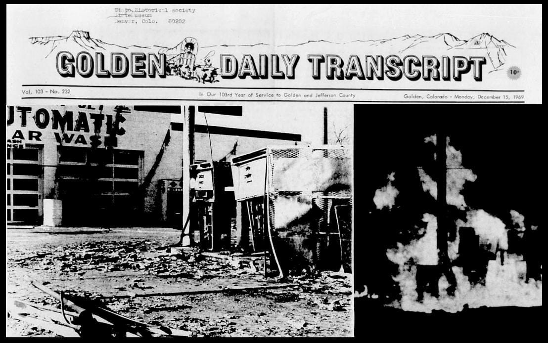 The December 15, 1969 Golden Transcript described a fire at the Frontier gas station at 10th and Washington. A State Highway Department employee had filled his tank at the station but forgotten to remove the nozzle before driving away.