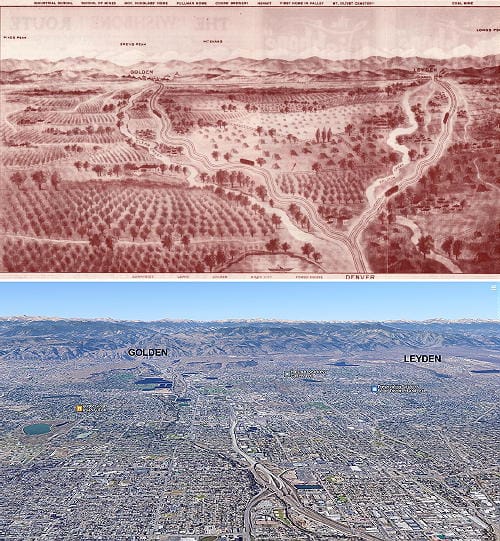 The top map comes from a 1907 brochure that advertised the “Wishbone Route.” This was a three hour trolley tour that went from Denver to Leyden, then to Golden. The lower map is a similar view today, taken from Google Earth.