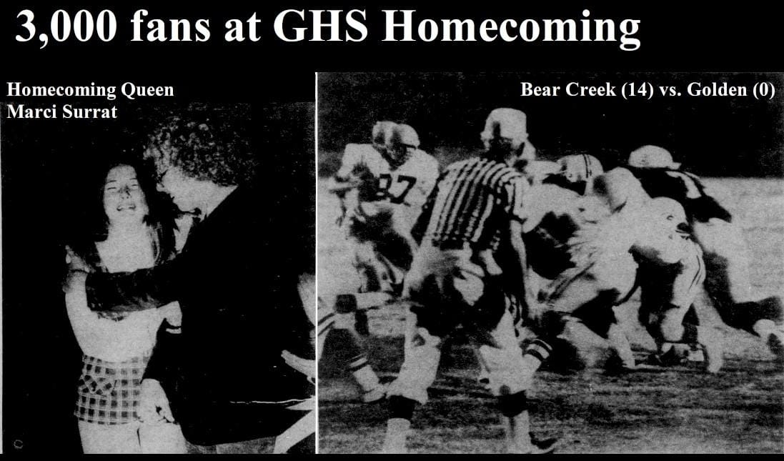 I wondered how Golden High School had celebrated Homecoming on the school’s 100th anniversary, so I checked the Golden Transcripts from the fall of 1973. To my surprise, the centennial wasn’t mentioned as part of Homecoming.
