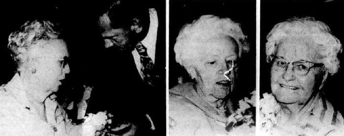 Art Papenfus served as the master of ceremonies and presented maroon and white corsages to five women from “turn of the century classes,” including Floss Maughan Altvater (class of 1908); Viola Seaver and Maud White (1909); Mary Ballinger Kerr (1910); and Blanche Crawford (1911). Maud Priest, who had been teaching at the school since 1932, also received a corsage.