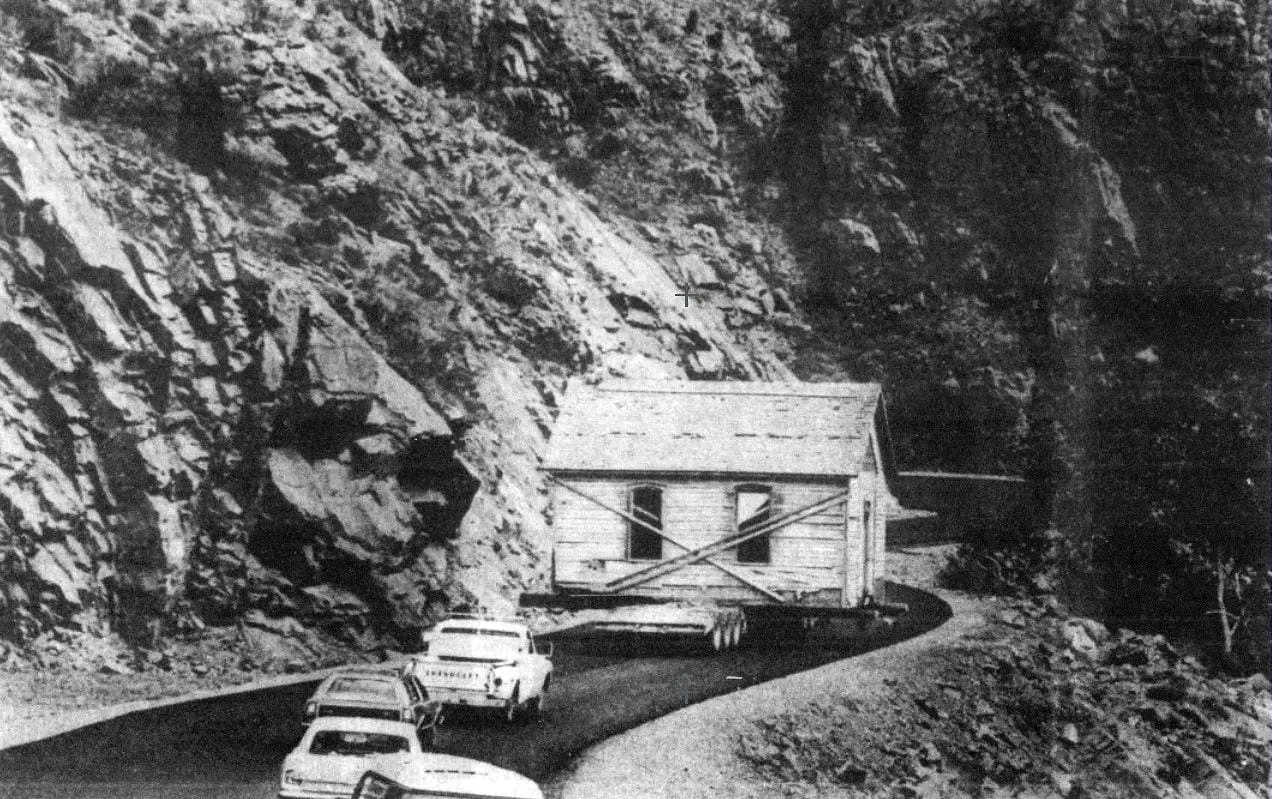 The 100 year old building was separated into two pieces (the entryway and the main schoolroom) for the move and then loaded on a flatbed truck. According to the Transcript, “A parade of cars filled with students, U.S. Marines and parents from the Mitchell Elementary School PTA followed the Guy Hill school through Golden Gate Canyon.”