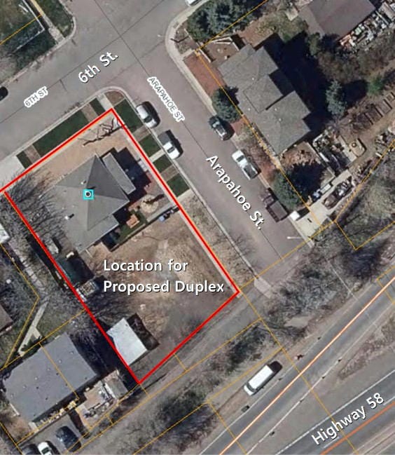 Planning Commission will consider a Site Development Plan for 600 Arapahoe Street (map). The homeowners hope to subdivide their property and build a duplex on the southern half of their yard. The plan would require a curb cut for a driveway off Arapahoe Street, which qualifies as a “Major Adjustment” to code standards. The site, which is next to Highway 58, would be subject to higher-than-allowable noise levels, so building there would require special permission from City Council.