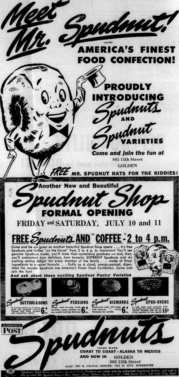 Spudnuts were sweet, deep-fried pastries made of potato flour. They were sold at 805 13th Street (map) from 1953 until 1984. Long-time Golden residents still wax rhapsodic about them.