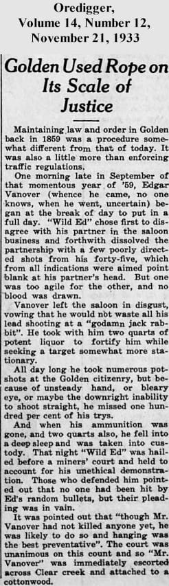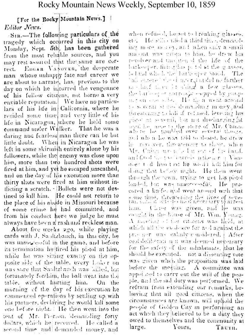 This tale was told briefly in the September 10, 1859 edition of The Rocky Mountain News Weekly, in an article entitled “Full Particulars of the late Lynching Case at Golden City.” The article ended with the remark, “We refrain from extending our remarks, believing that all good citizens, when the circumstances are known, will uphold the people of Golden City in performing an act which they believed to be a duty they owed to themselves and the community at large.”