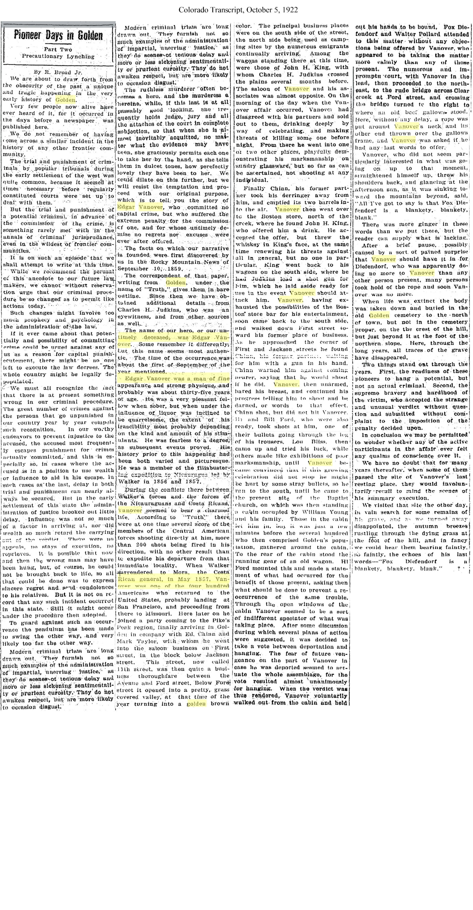The story was retold, with more detail, in the October 5, 1922 edition of the Colorado Transcript. That article was based on interviews with people who had been present for the hanging.