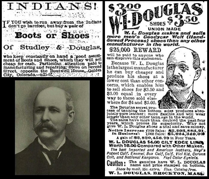The Transcript liked to point out that much of Douglas’s success came from advertising in newspapers. Douglas advertised in papers all over the county, including the Colorado Transcript, but the Transcript had the honor of printing Douglas’s very first advertisement, in the June 5, 1867 edition. The Plains Indian War was heating up at that time, and he suggested that a pair of his shoes would help you run away from hostiles.