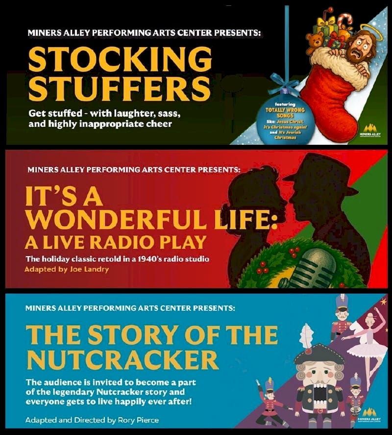 The creative team at Miners Alley Performing Arts Center will be BUSY from now till the end of the year. They are offering THREE holiday plays. Stocking Stuffers and It's a Wonderful Life: A Life Radio Play will play in repertory for matinee and evening performances. The Story of the Nutcracker (for young audiences) will play in morning and noon performances.