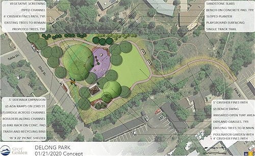 At Tuesday night’s Parks Recreation and Museums Advisory Board meeting, the consultants showed the proposed site plan for DeLong Park on 23rd Street. You can view the plan on Guiding Golden. I’m pretty happy with it; they didn’t try to crowd too much into that small plot of land.