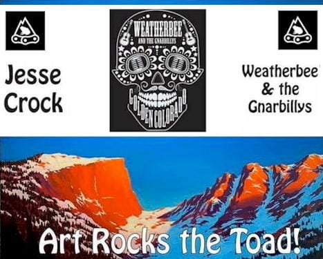 4-7PM Golden’s Artist Laureate (I made up the title) Jesse Crock will be painting today at Mountain Toad Brewery. Art Rocks the Toad features live music by Weatherbee and the Gnarbillys and live art by Jesse. We will keep pickin’ and playin’ as long as you dig it. Jesse Crock will be providing pieces of art live in front of your face. We will be doing drawings throughout the show, and at the end you may be the lucky one to walk away with a Jesse Crock original.