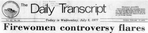 The July 6, 1977 Golden Daily Transcript included a front page article about the controversy concerning women working as firefighters. At that time, the Pleasant View and Lookout Mountain Fire Departments included women, but Golden and Fairmount remained all male, “…and they like it that way.”