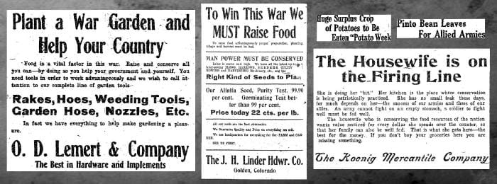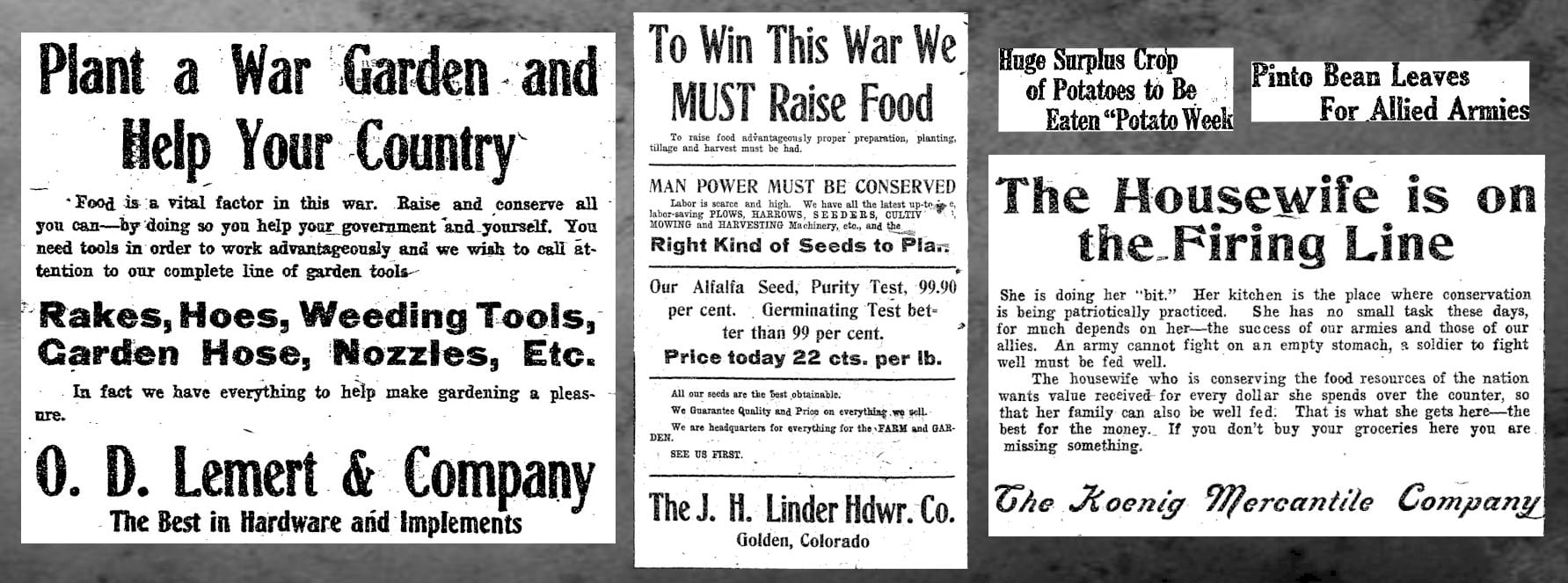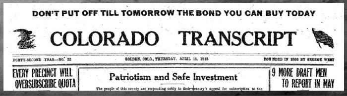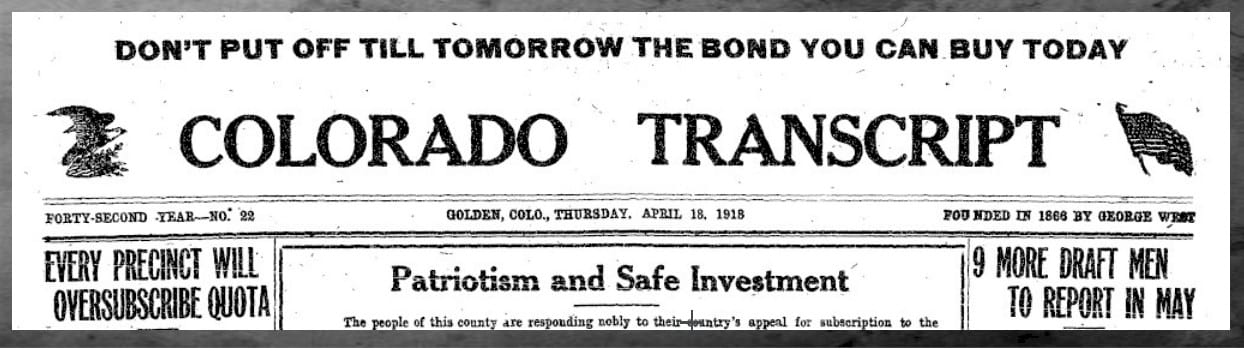 The April 18, 1918 Colorado Transcript showed Golden on a wartime footing, with at least half of the articles and advertisements reminding the public of their patriotic duties.
