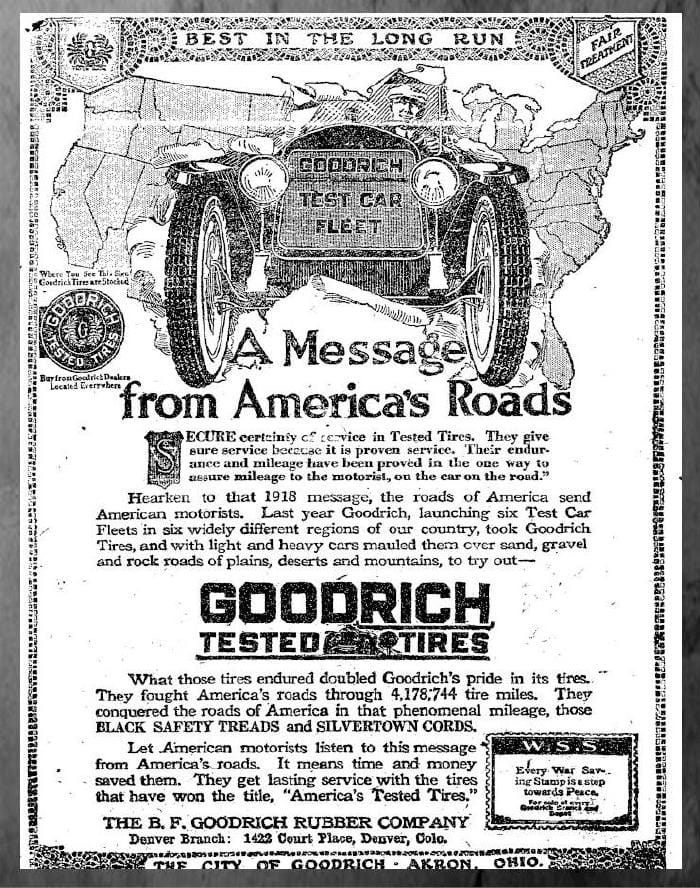 Even products that had no particular connection to the war adopted the wartime parlance. Notice this Goodrich tire advertisement, which says “They fought America’s roads through 4,178,744 tire miles. They conquered the roads of America in that phenomenal mileage….”