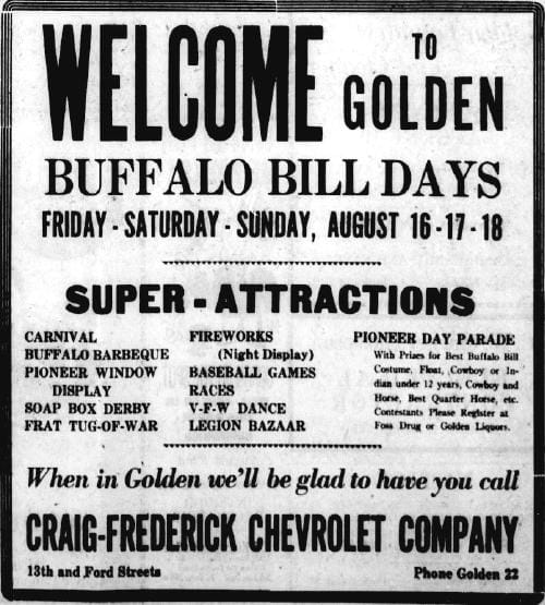 Pre-COVID, we were scheduled to be celebrating Buffalo Bill Days this weekend. Alas, that won’t happen this year, but I thought you might enjoy seeing this ad from 1946–the very first year that we had Buffalo Bill Days.