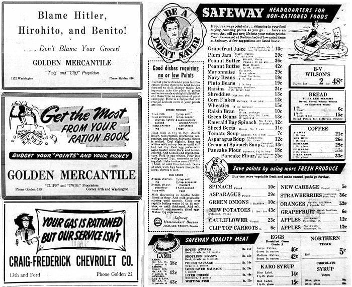 From 1941-1945, World War II was a part of every aspect of life…school, work, play, eating. The newspaper articles of the time reported on which local boys had been wounded overseas and which had died. The community worked on clothing drives, food drives, and war bond drives. Many things were rationed, including food, gasoline, and rubber. The grocery stores detailed the points needed as well as the cost of foodstuffs.