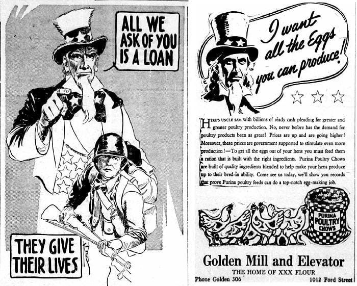 Uncle Sam was everywhere…promoting war bonds on one page and encouraging everyone to buy chicks from the Golden Mill in the next.