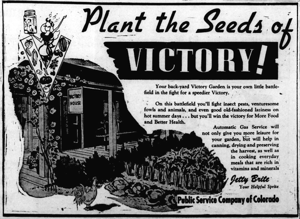 At a time when American industry was dedicated to the war effort, consumer goods were in short supply. Without exciting new merchandise to promote, many advertisers found reasons to write about Victory Gardens. The hardware stores, of course, sold seeds. Greenhouses sold bedding plants. Public Service (the gas company) made a longer stretch, explaining that having gas service in the house would save time, allowing readers to spend more time on their Victory Gardens.